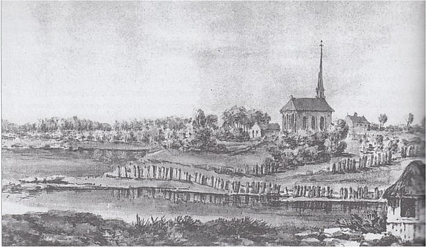 ![]() Seule représentation de la première église (aquarelle 1765) Sole representation of the first church (watercolor 1765) |